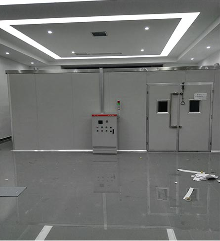 大型步入式老化房用由循環風機吸取工作室內空氣,吸入風道內,經發熱元件,加熱空氣后將熱空氣由兩側面風道均勻的吸入工作室同工件進行熱交換。再回到工作室頂部風道,構成一個強制對流循環。如此反復循環,使得工作室溫度升高。此設備構造和熱風循環原理一樣,確保了烘箱內各個區域的溫度均勻性,排除了低溫死角及盲區。