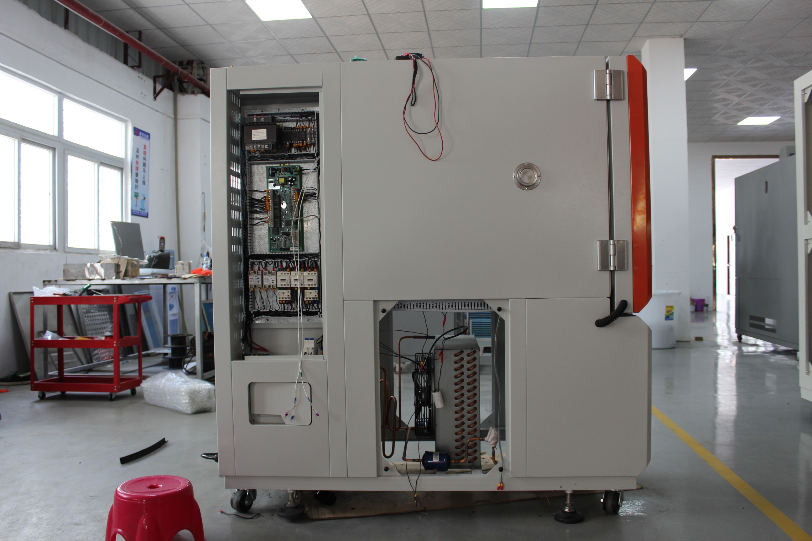 首先檢查濕球紗布的懸掛方式及懸掛位置,正對(duì)著試驗(yàn)箱,打開箱門,工作室的右上面一支傳感器為干球,下面一支傳感器為濕球,正常情況下,必須將紗布掛在下面的一支傳感器上,且紗布下端必須可靠的浸在積水頭水槽內(nèi),以便濕球紗布能可靠的吸水。